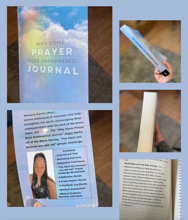explore your prayer life with this amazing little journal/book written by Monique Cole Garcia. this journal includes interactive exercises, praise report entry slots, prayer list, scripture searches and more.