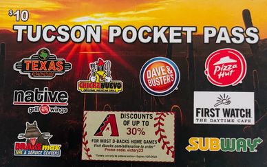 Support us by purchasing a $10.00 Tucson Pocket Passes good for: Texas Roadhouse | Pizza Hut | Dave & Busters | First Watch the day time cafe | Subway | native grill ‘& wings | Chickenuevo | BreakMax | Arizona Diamond back games
